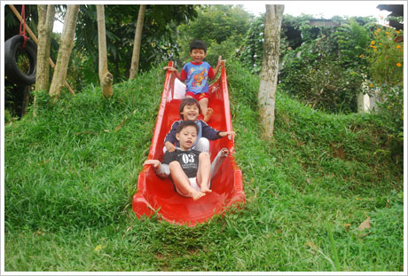 - beberapa jenis alat bermain di tempat terbuka untuk anak-anak seperti luncuran, ayunan dan ban untuk bergelantungan.